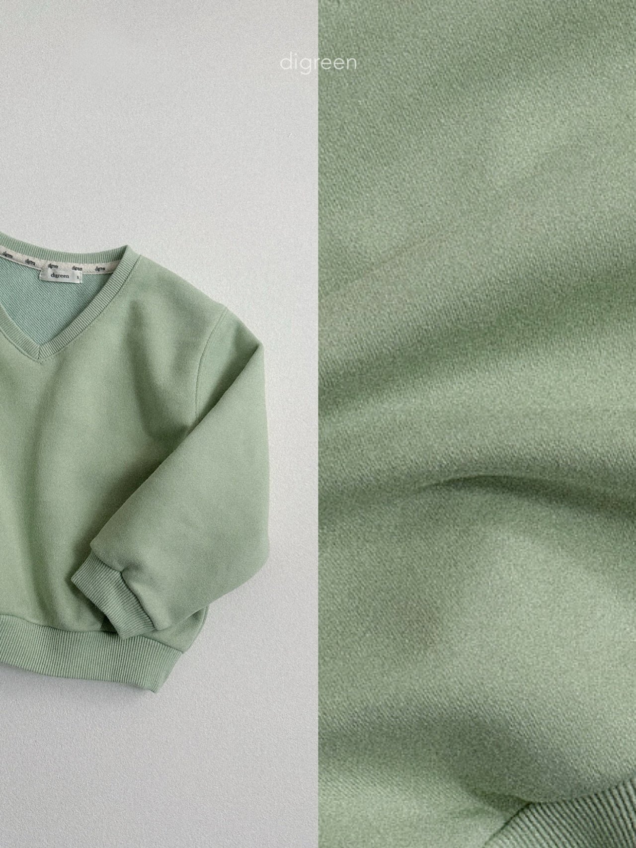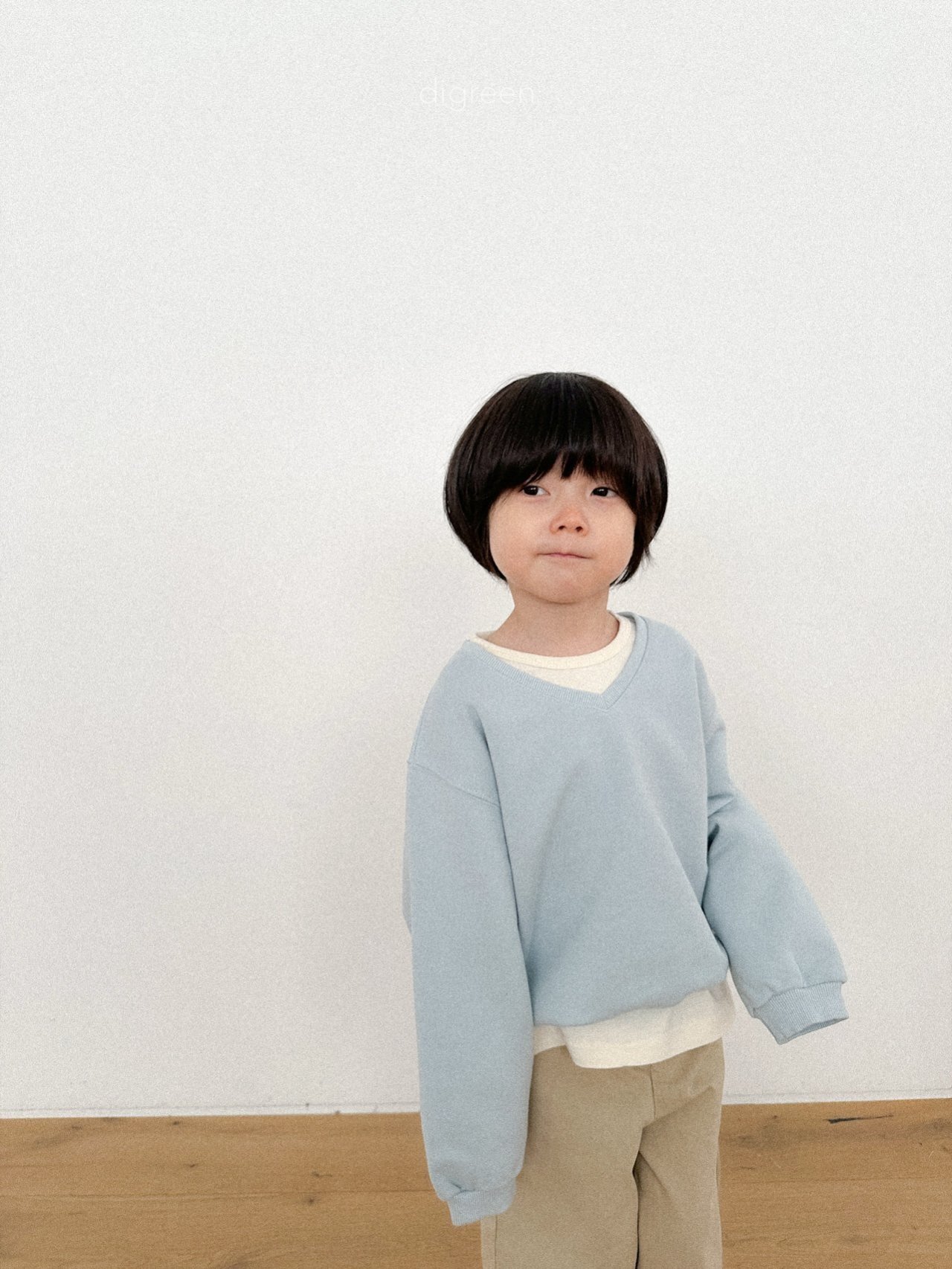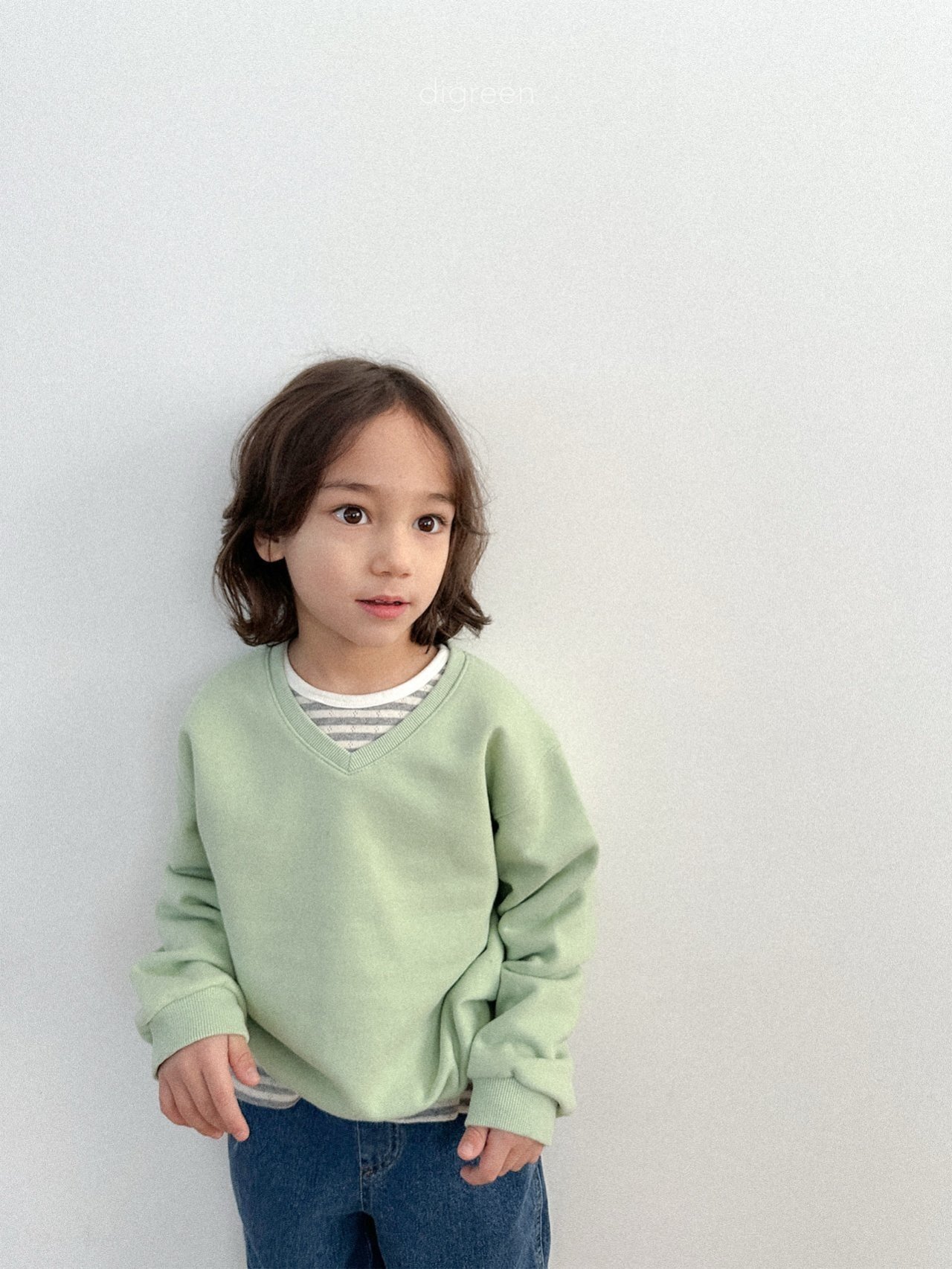 微微露出頸部線條的 V 領剪裁,能讓孩子的臉部輪廓看起來更加清晰,