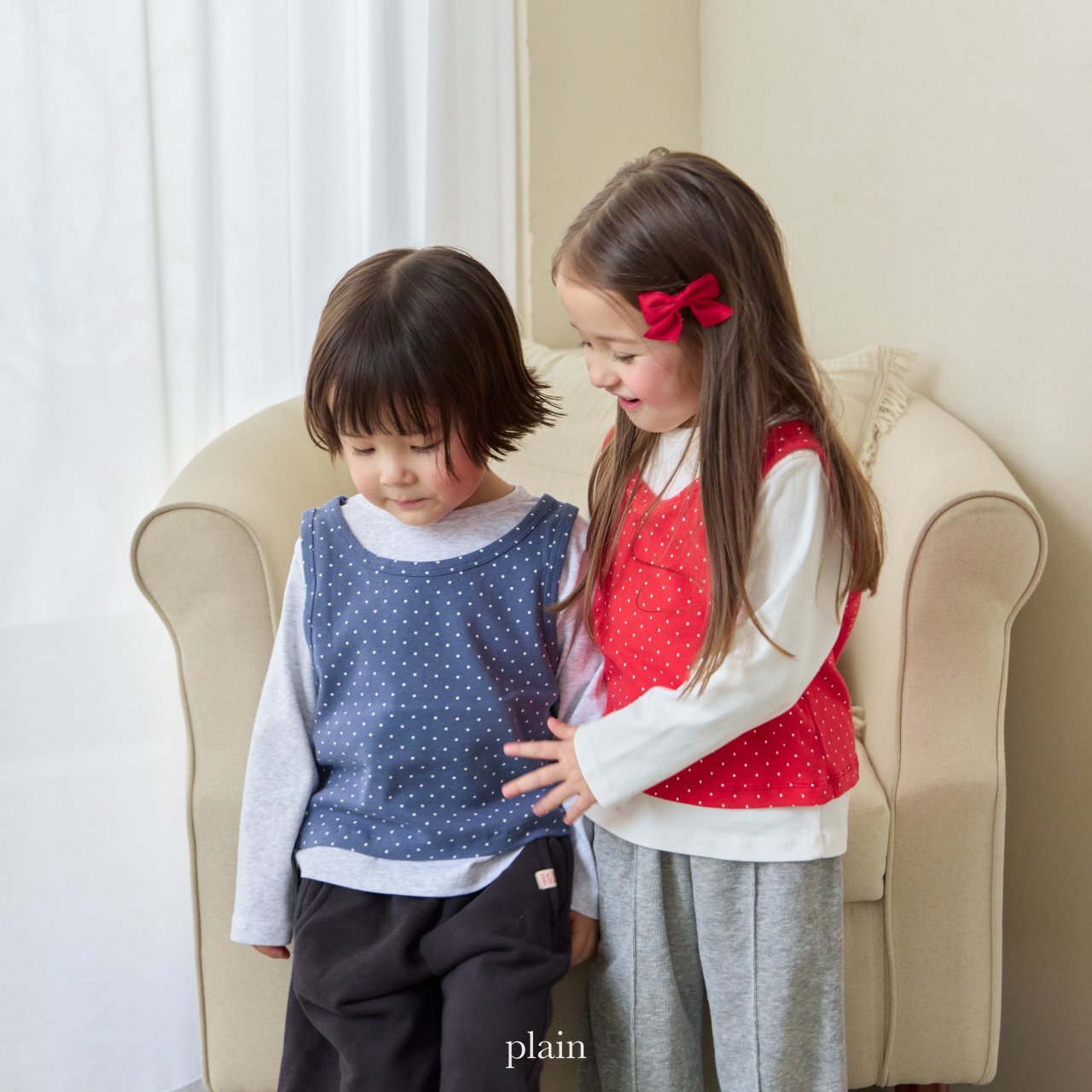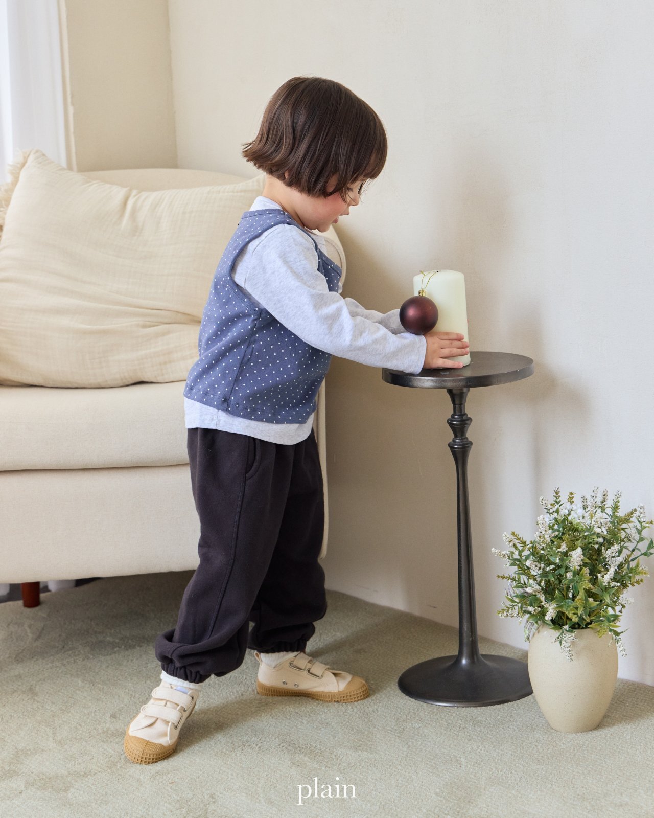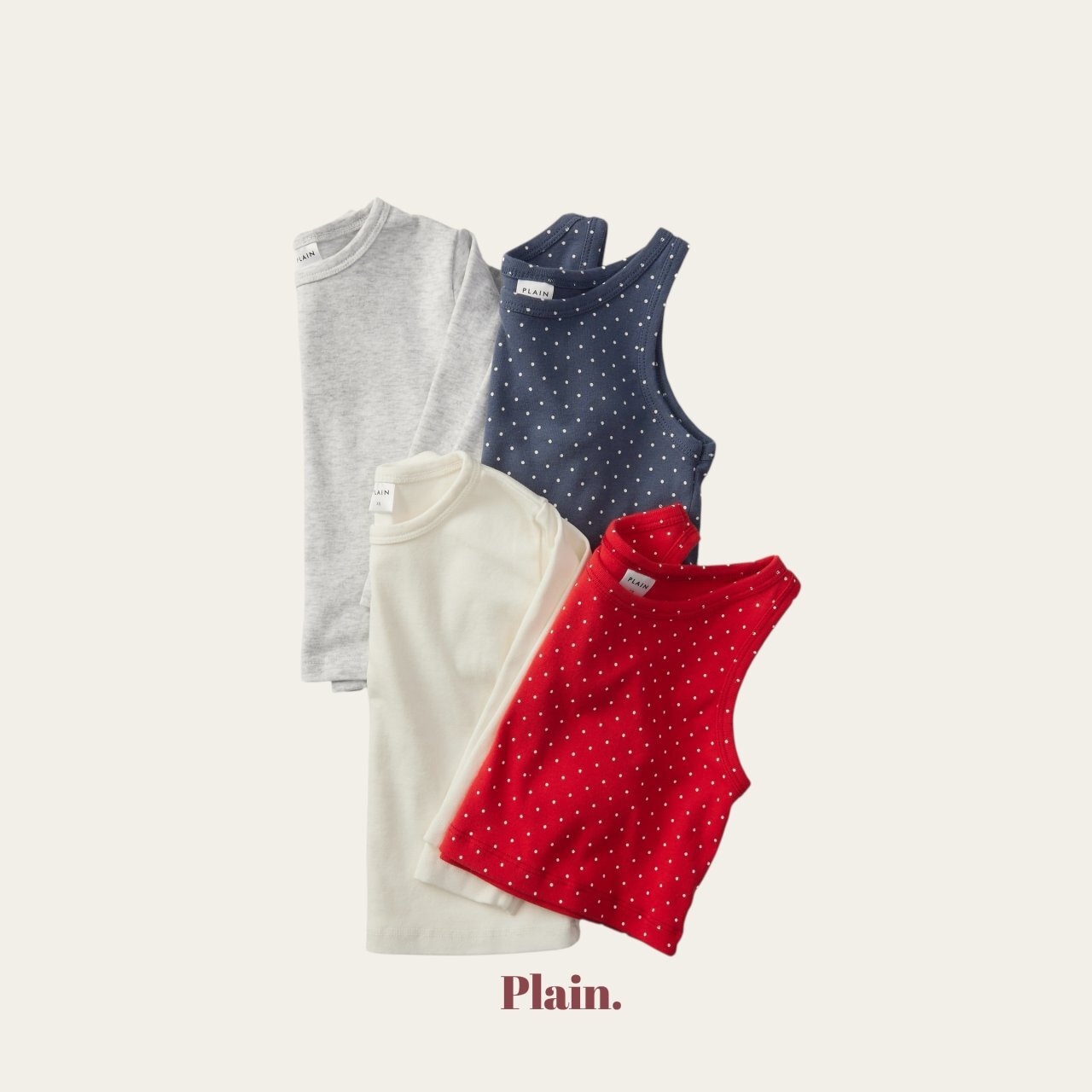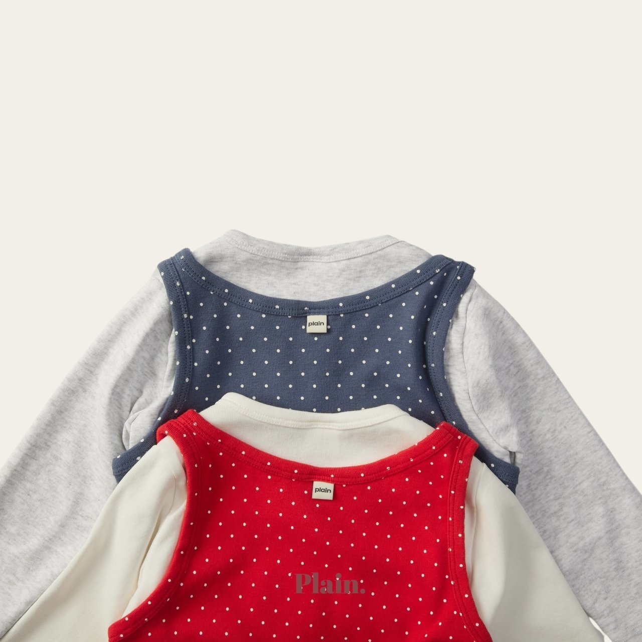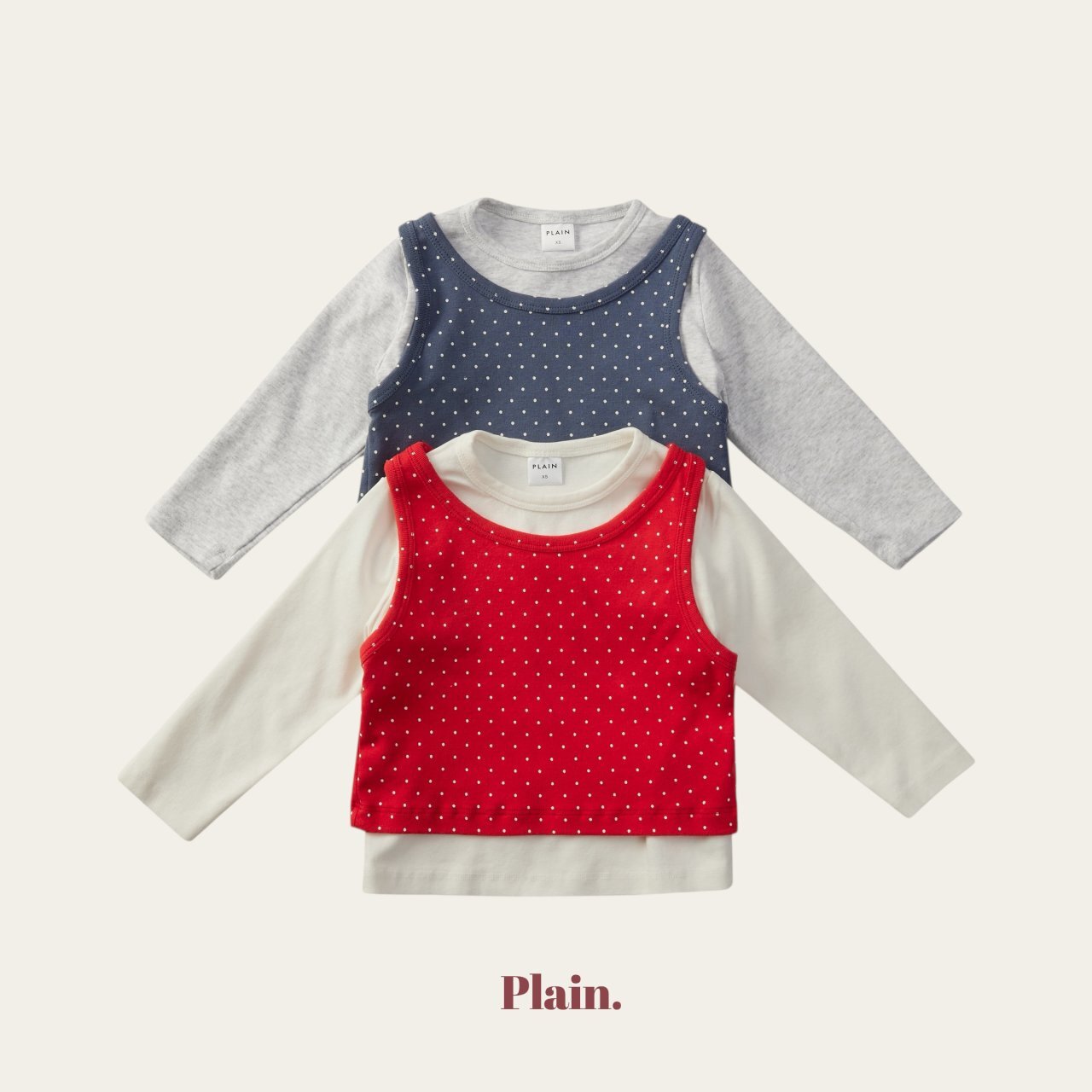 以挺實耐穿的基本T,搭配圓點背心組合而成的層次穿搭上衣