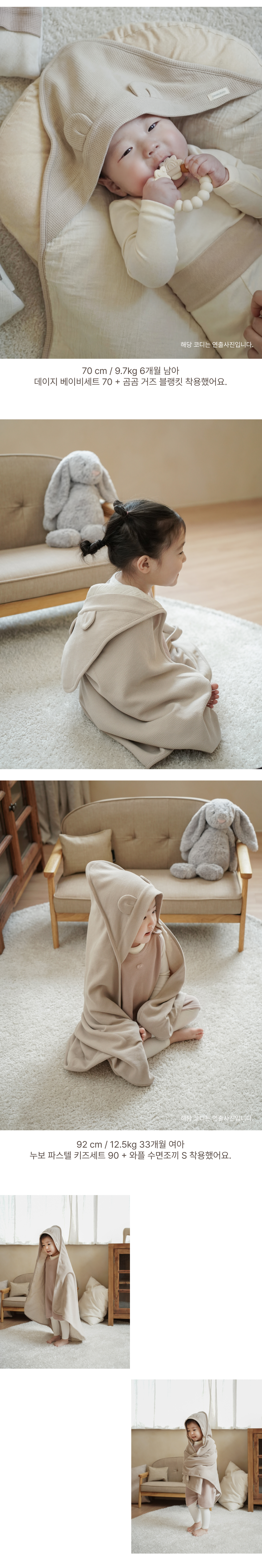 您可以將帶有可愛熊耳朵的部分蓋在寶寶頭上,然後將剩餘部分包裹在寶寶身上,打造出萌趣的造型