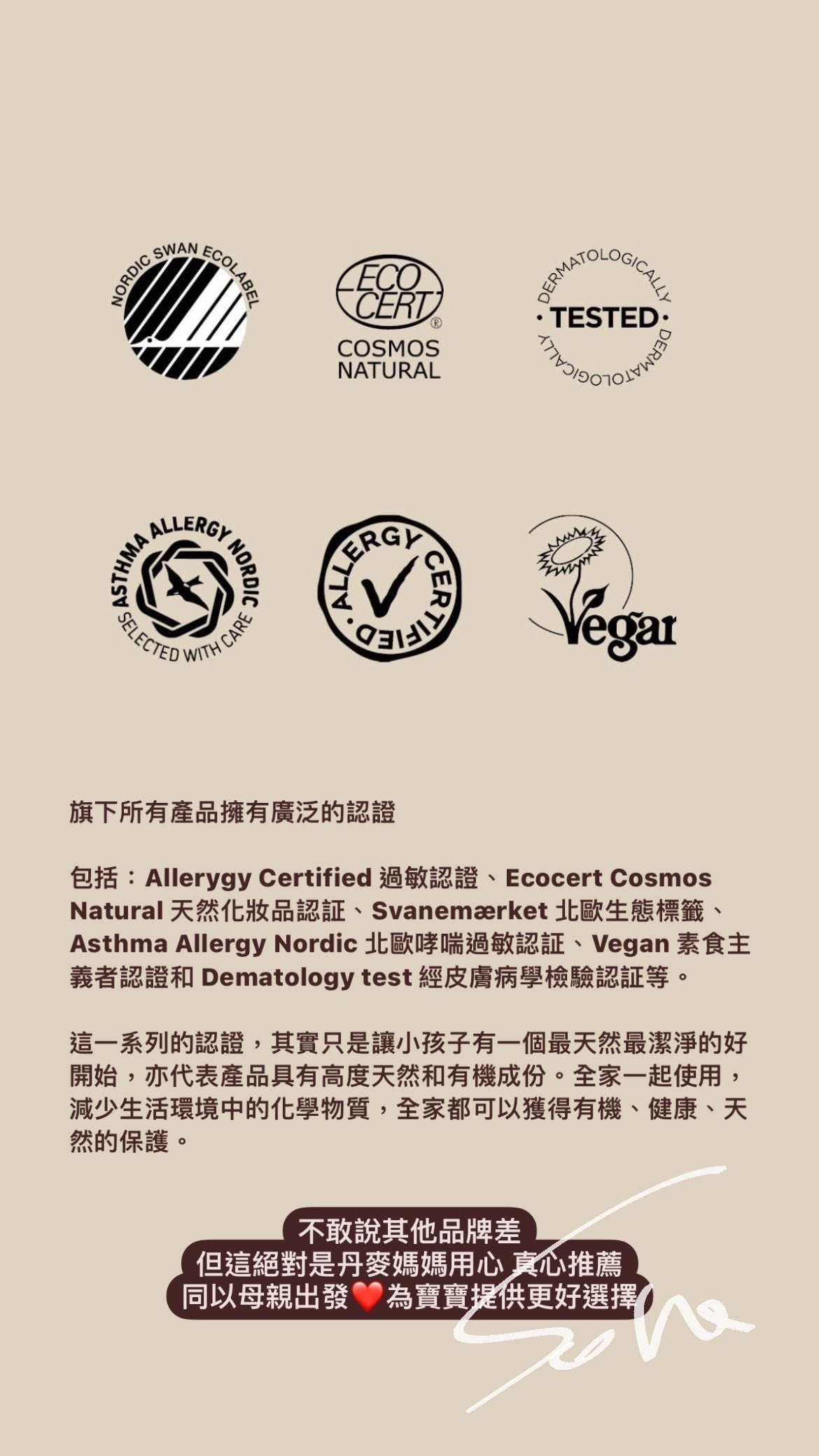 過敏認證、北歐天鵝生態標籤、Ecocert Cosmos Natural、北歐哮喘過敏、素食和皮膚病學測試