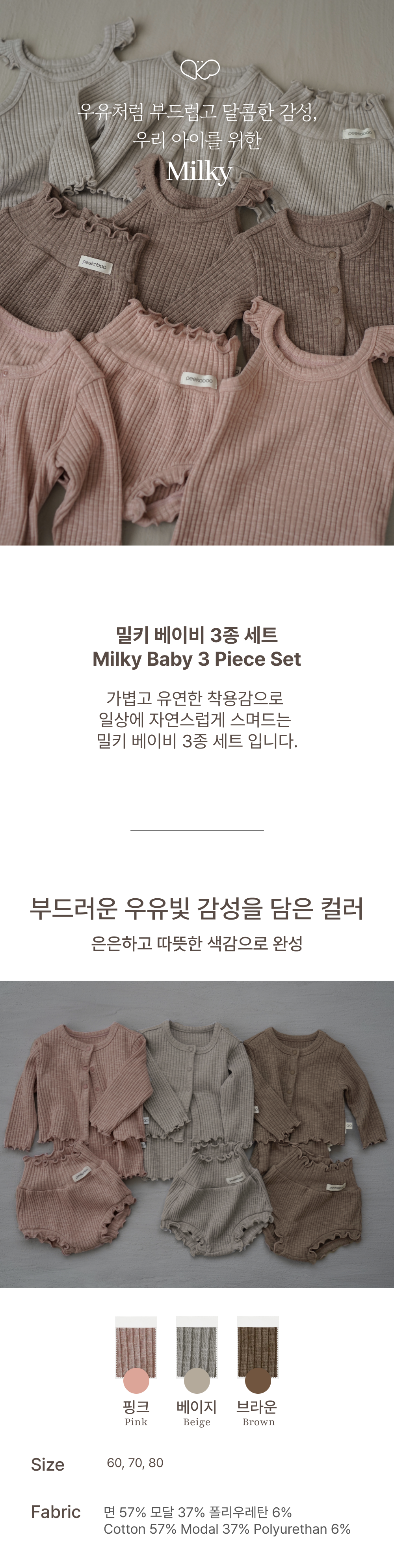 這款牛奶色套裝採用棉和莫代爾混紡布料,輕盈透氣,彈性十足,舒適貼合寶寶的活動