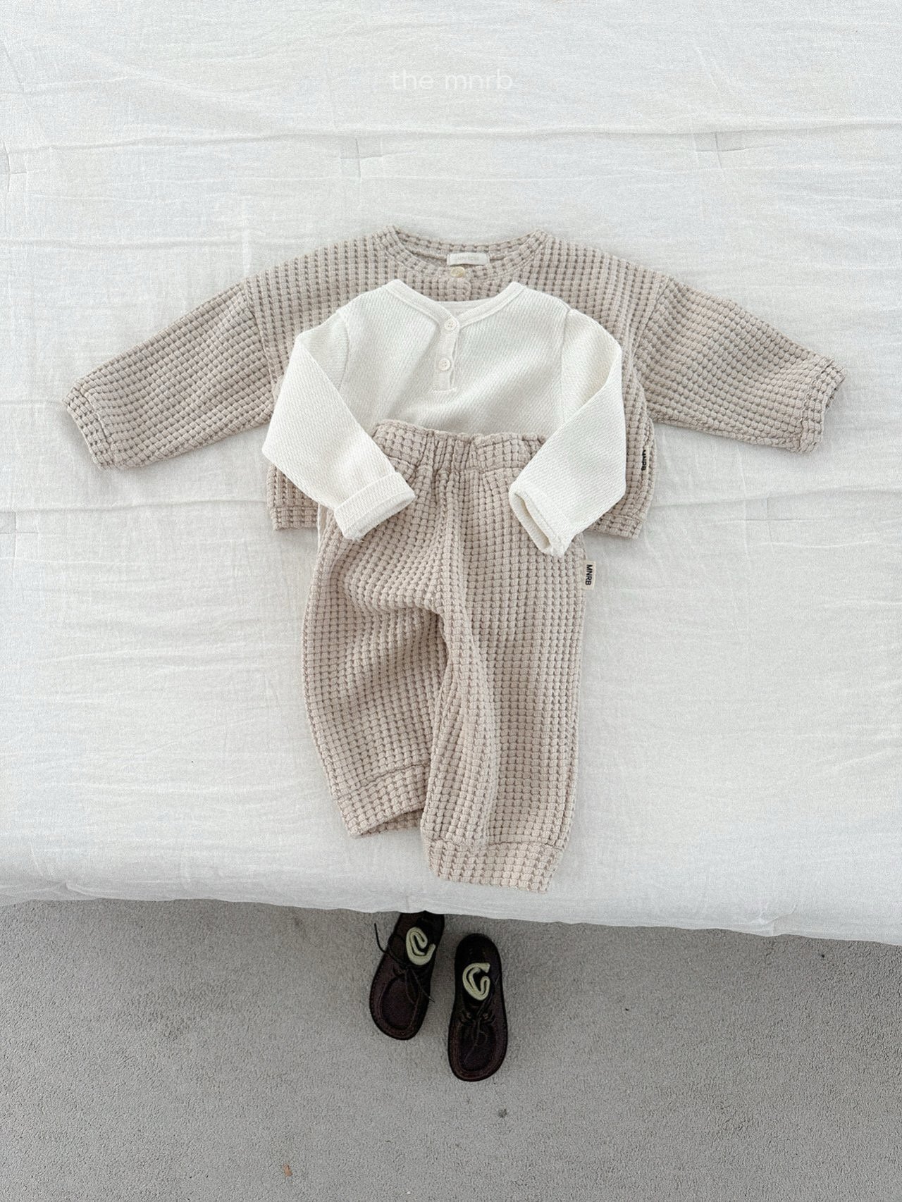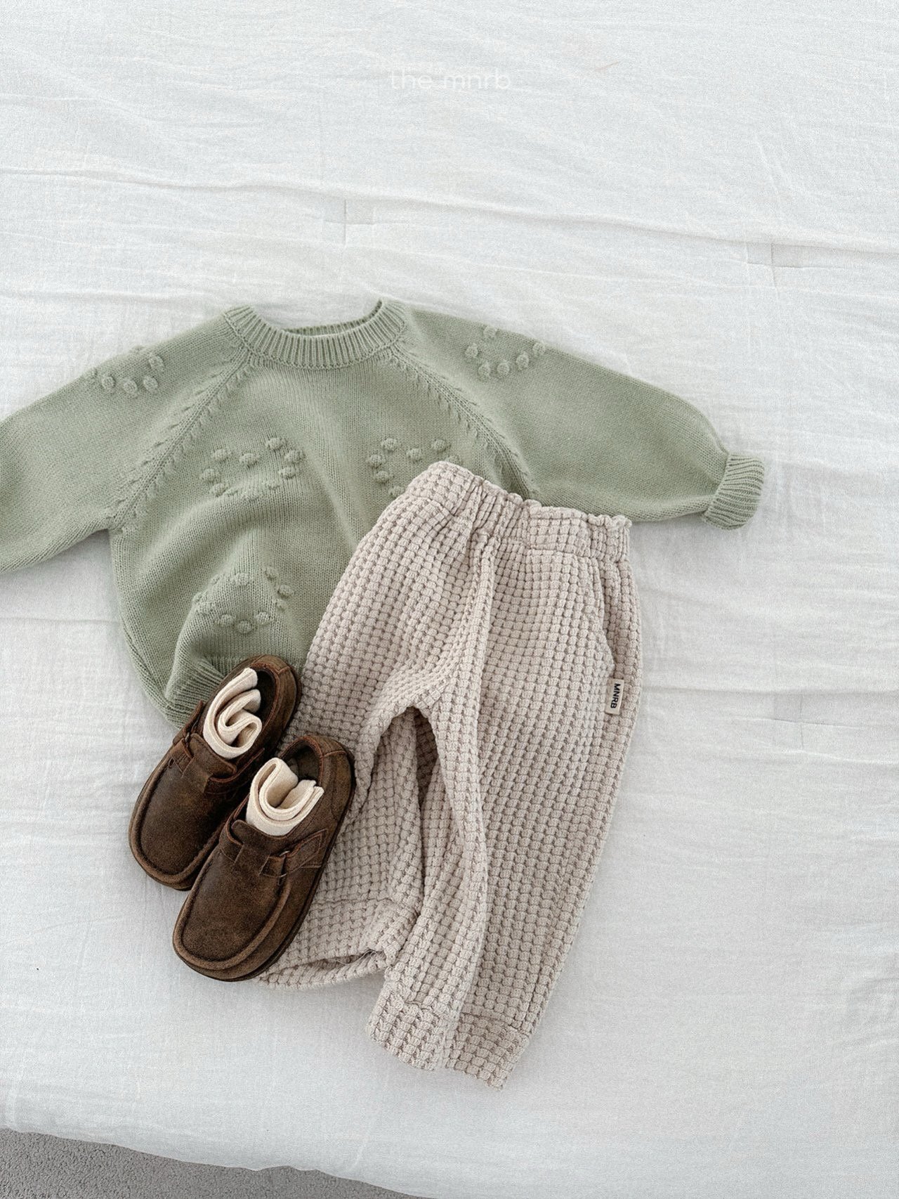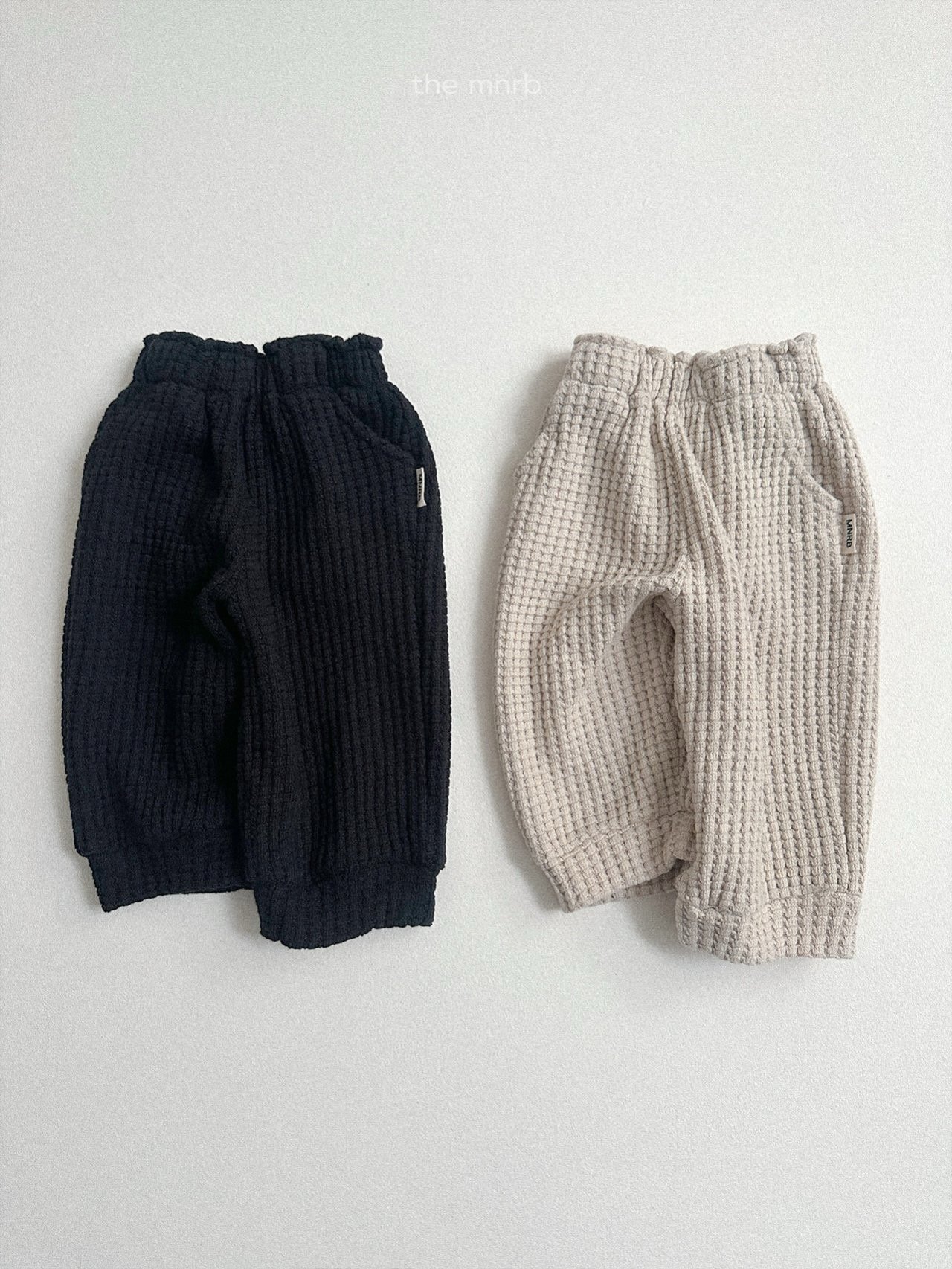 以大顆粒華夫格織紋布料製作,穿著感受輕鬆舒適的 Mone 長褲