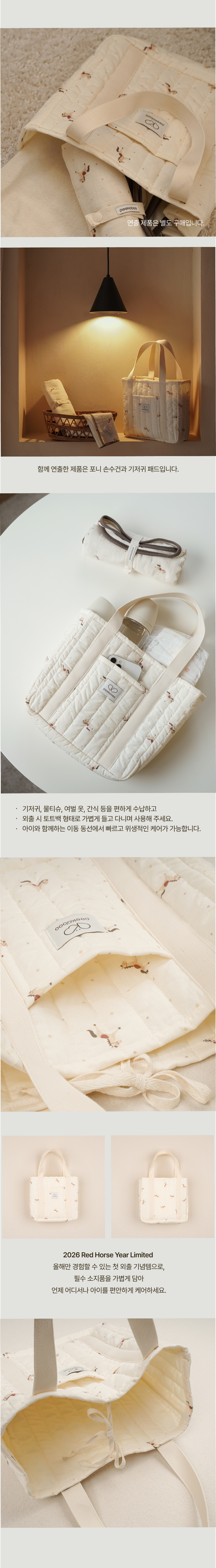 這款育兒包採用蓬鬆的絎縫布料,飾有可愛的小馬圖案,是外出時的點睛之筆