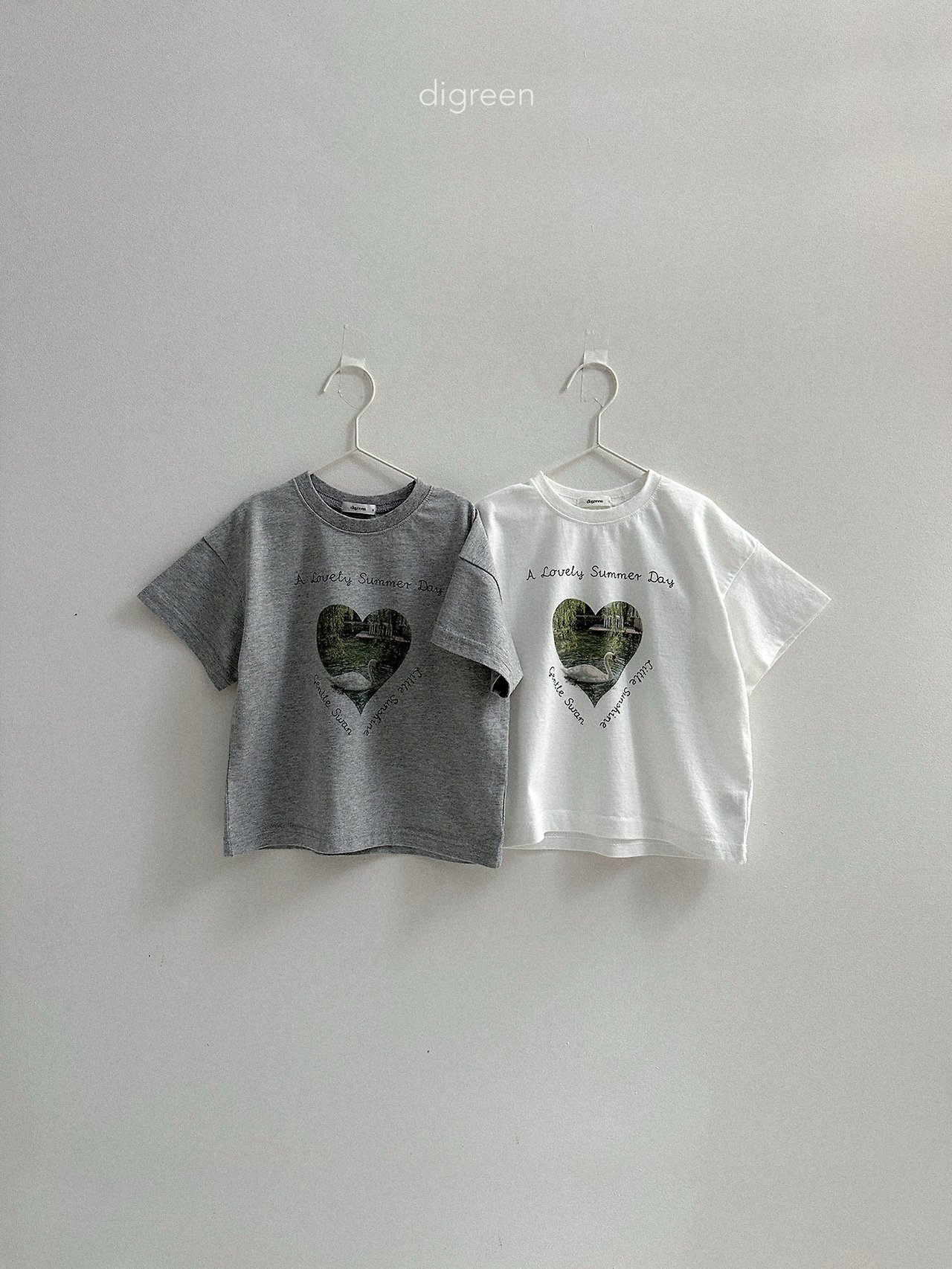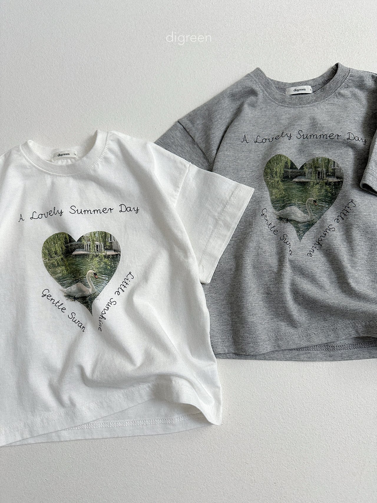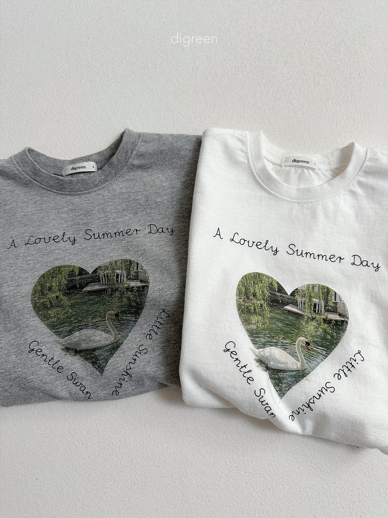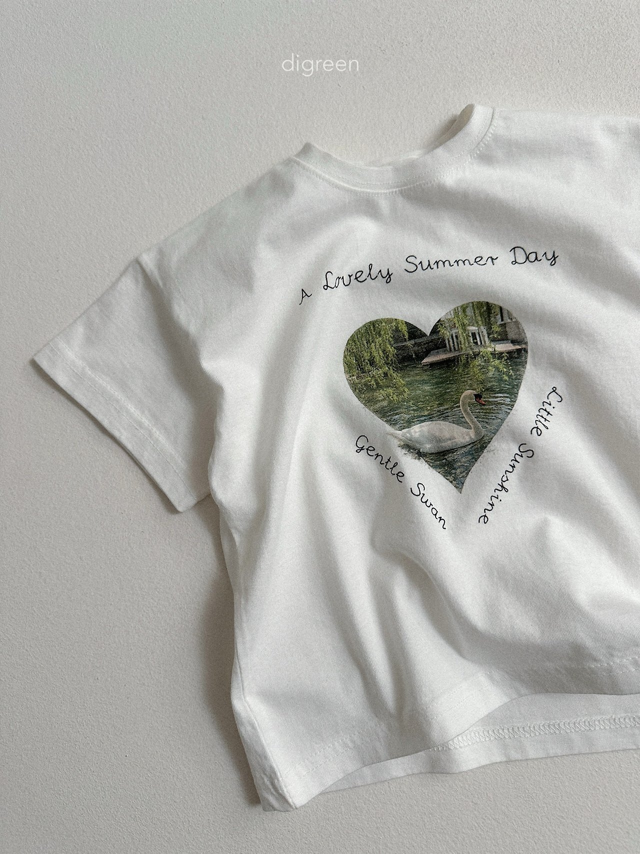 在細緻混色的白色布料上,搭配精緻呈現的天鵝圖案,讓這件T恤不只是基本款,而是多了一份氛圍感的單品