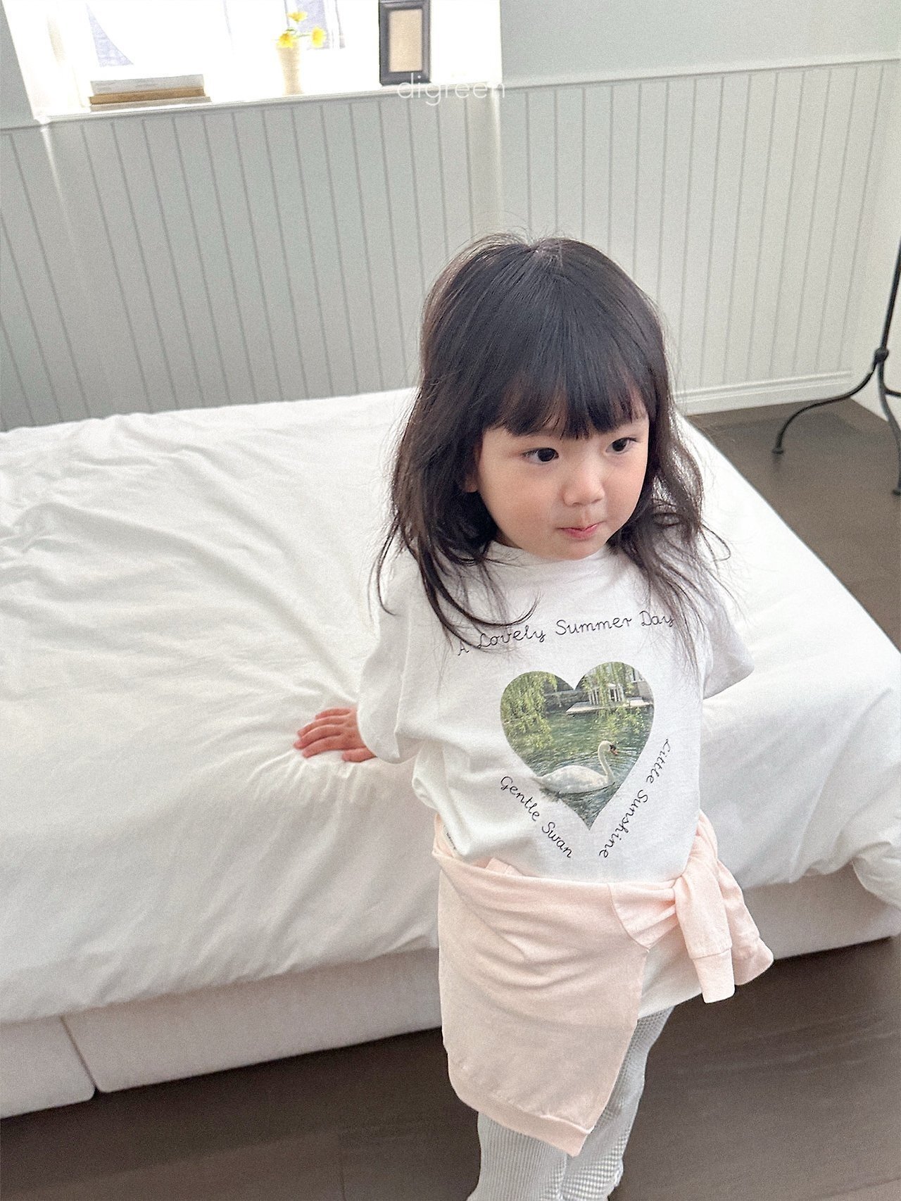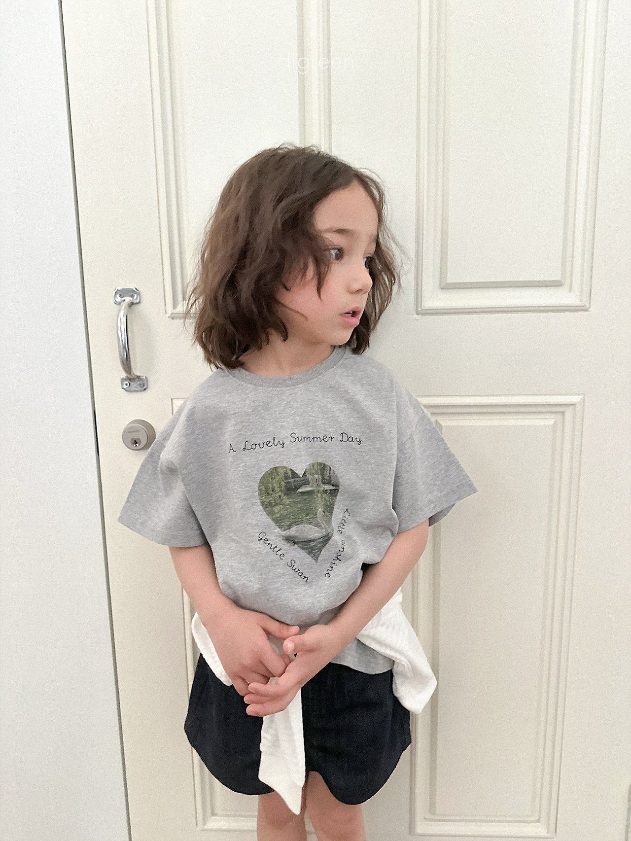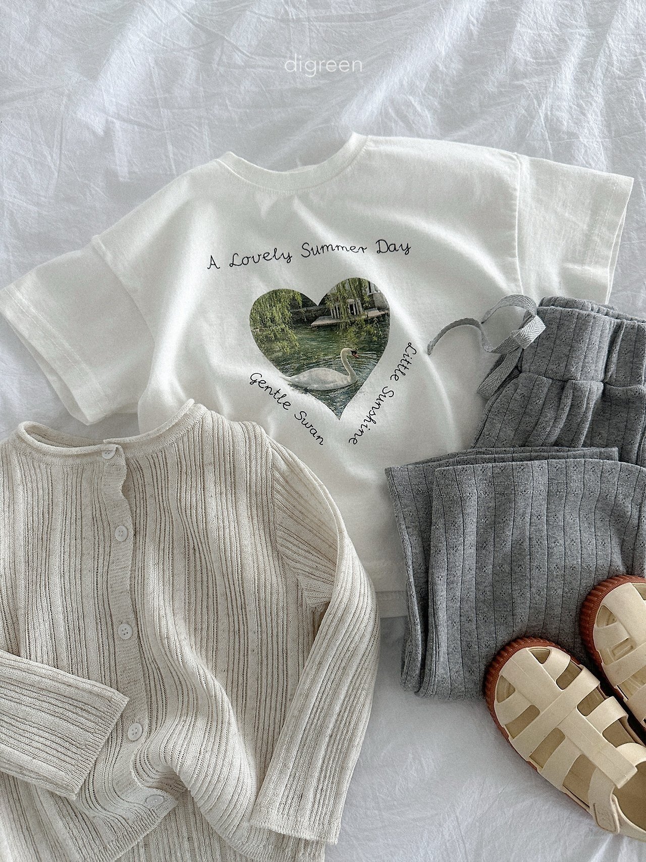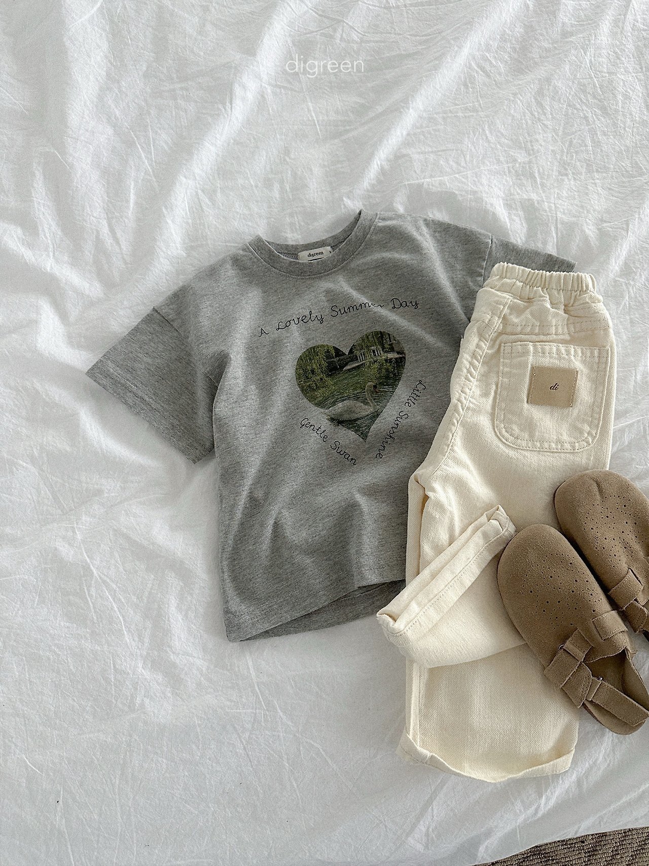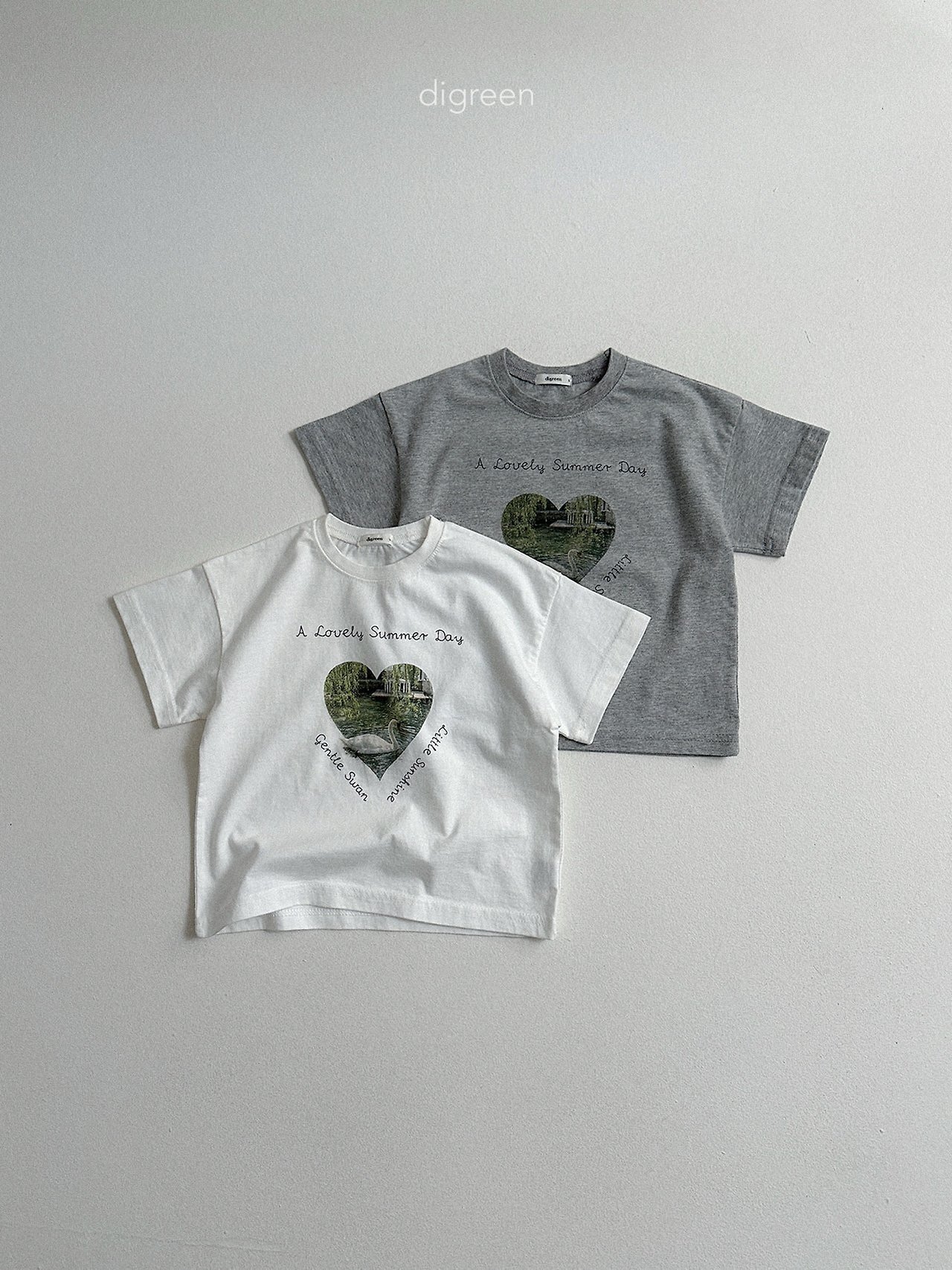 在細緻混色的白色布料上,搭配精緻呈現的天鵝圖案,讓這件T恤不只是基本款,而是多了一份氛圍感的單品
