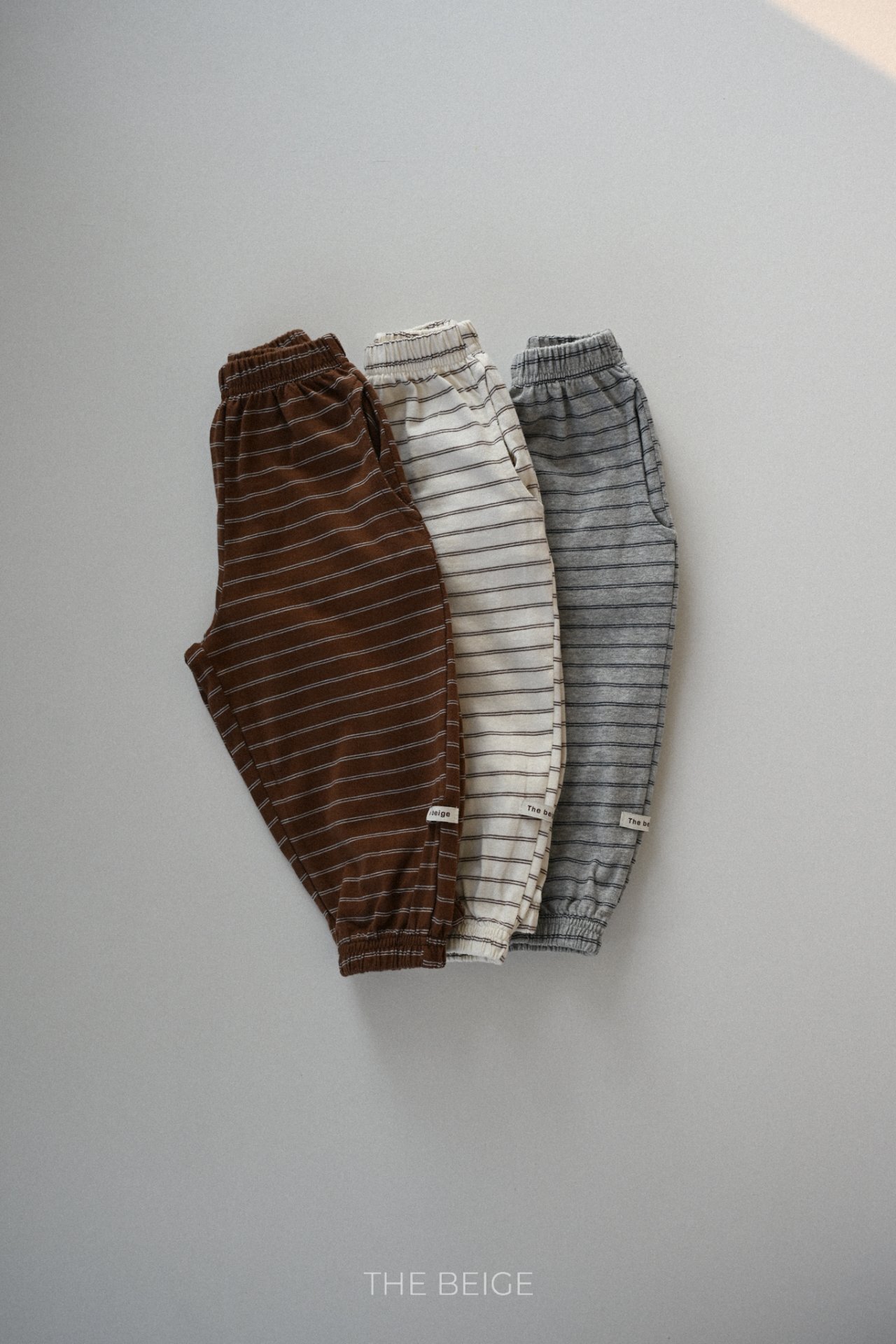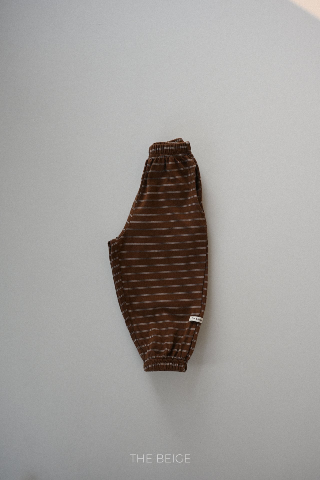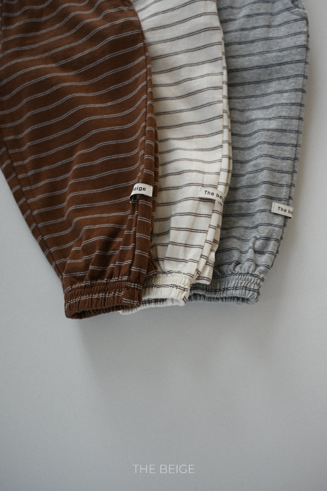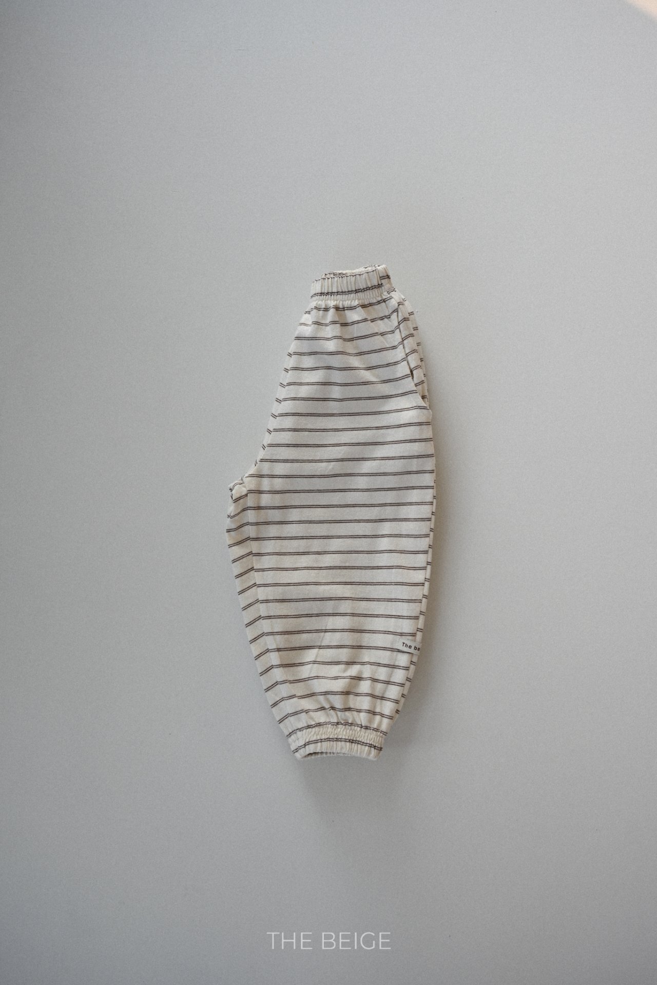 採用 20 支單面棉材質製作的休閒條紋束口褲,色彩點綴的條紋設計十分亮眼可愛