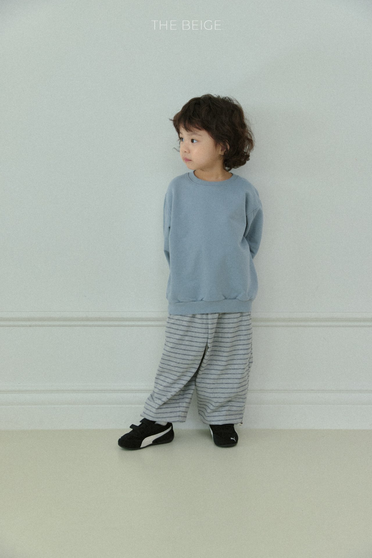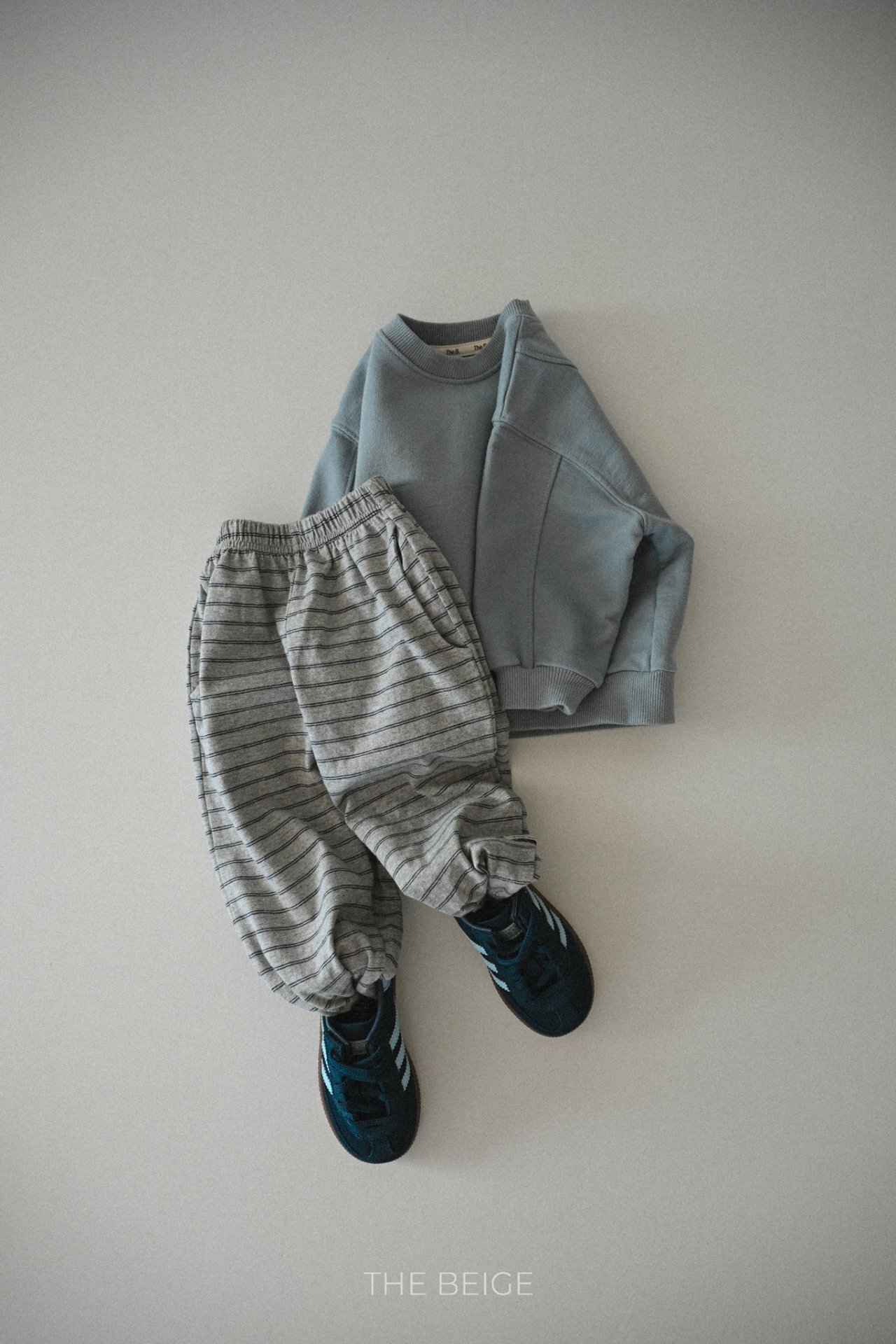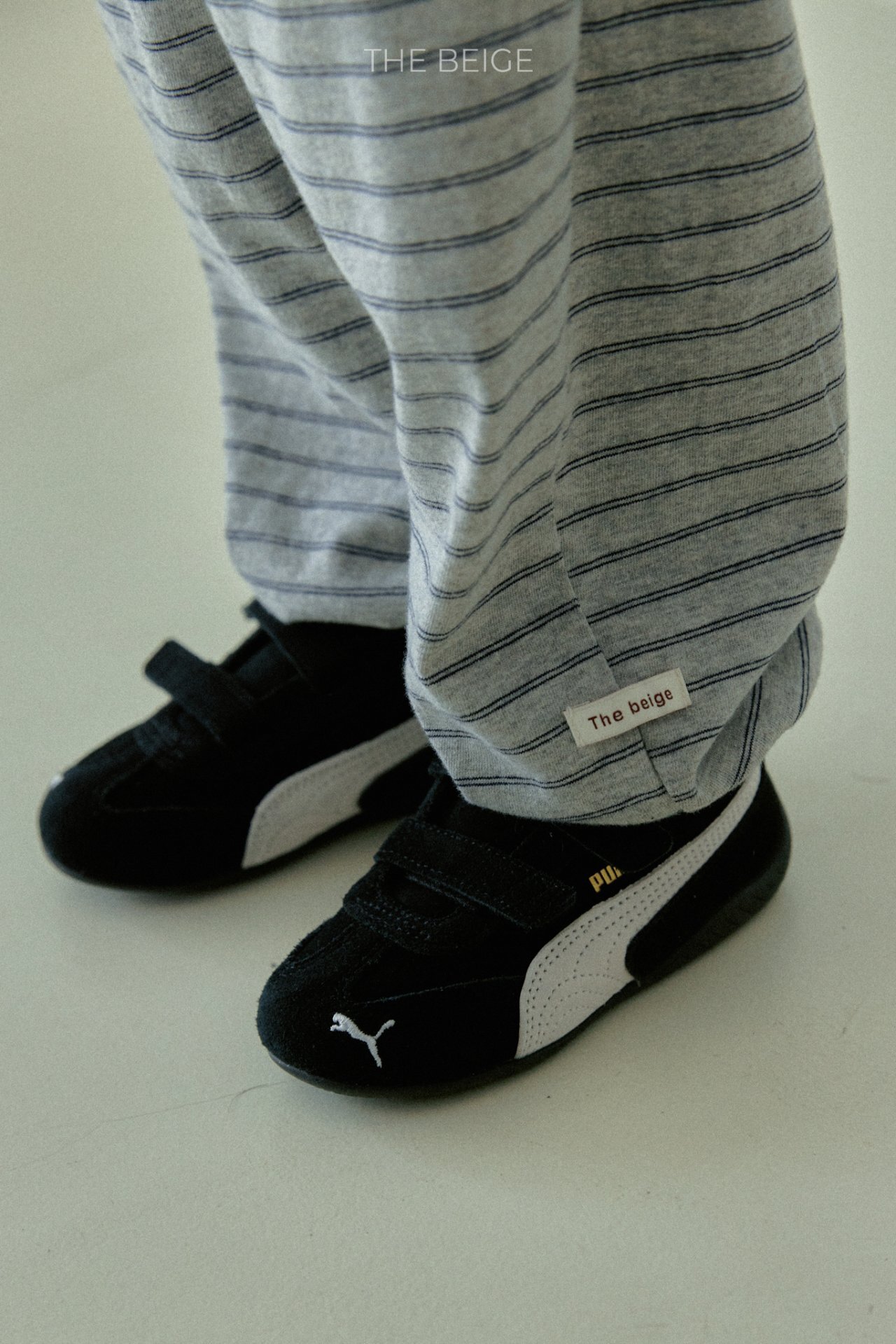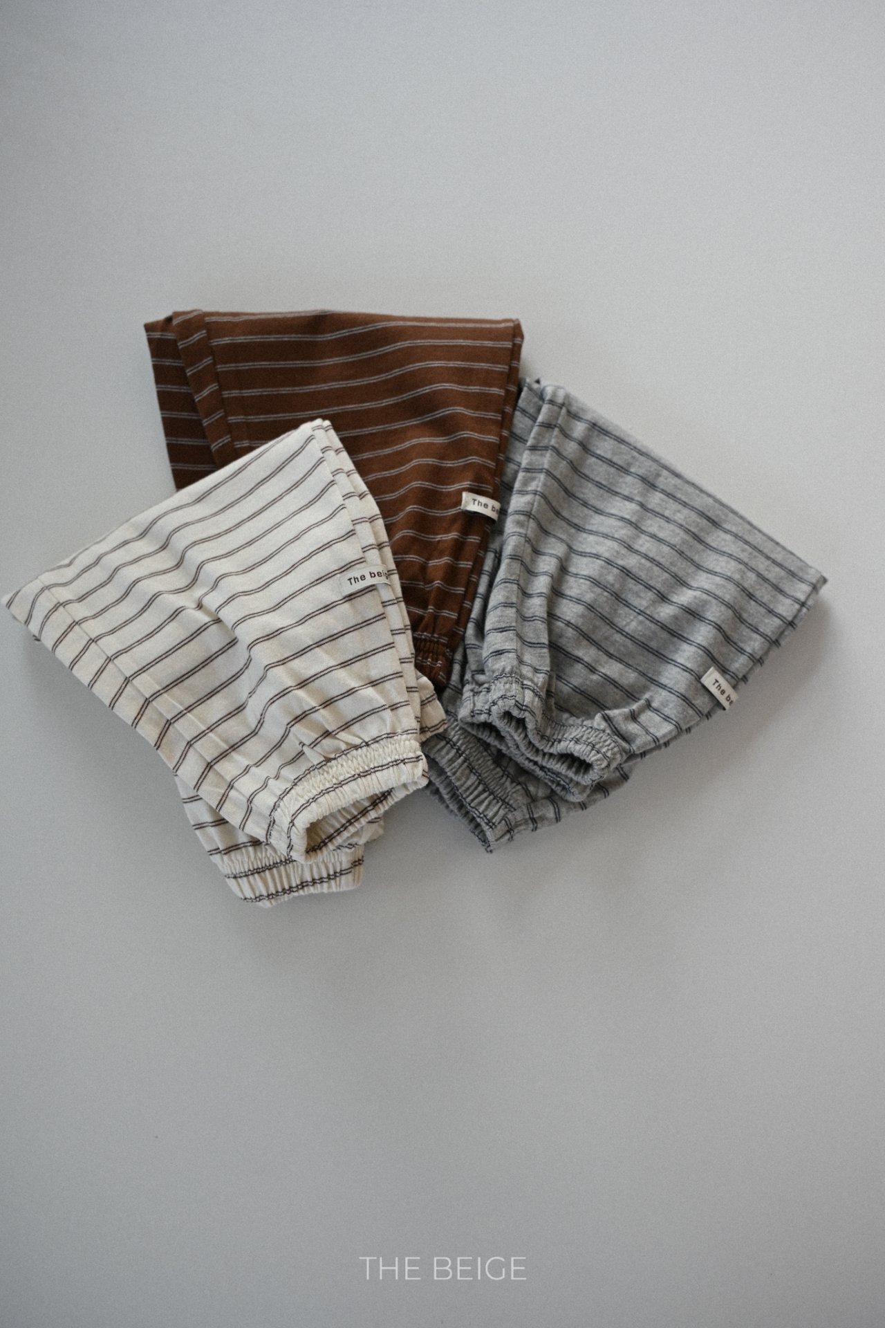 採用 20 支單面棉材質製作的休閒條紋束口褲,色彩點綴的條紋設計十分亮眼可愛