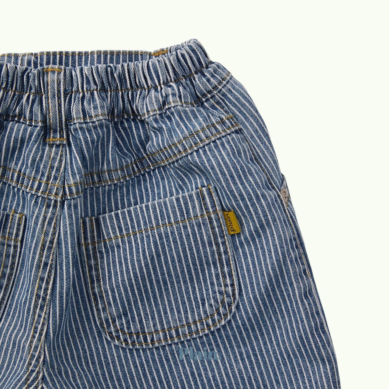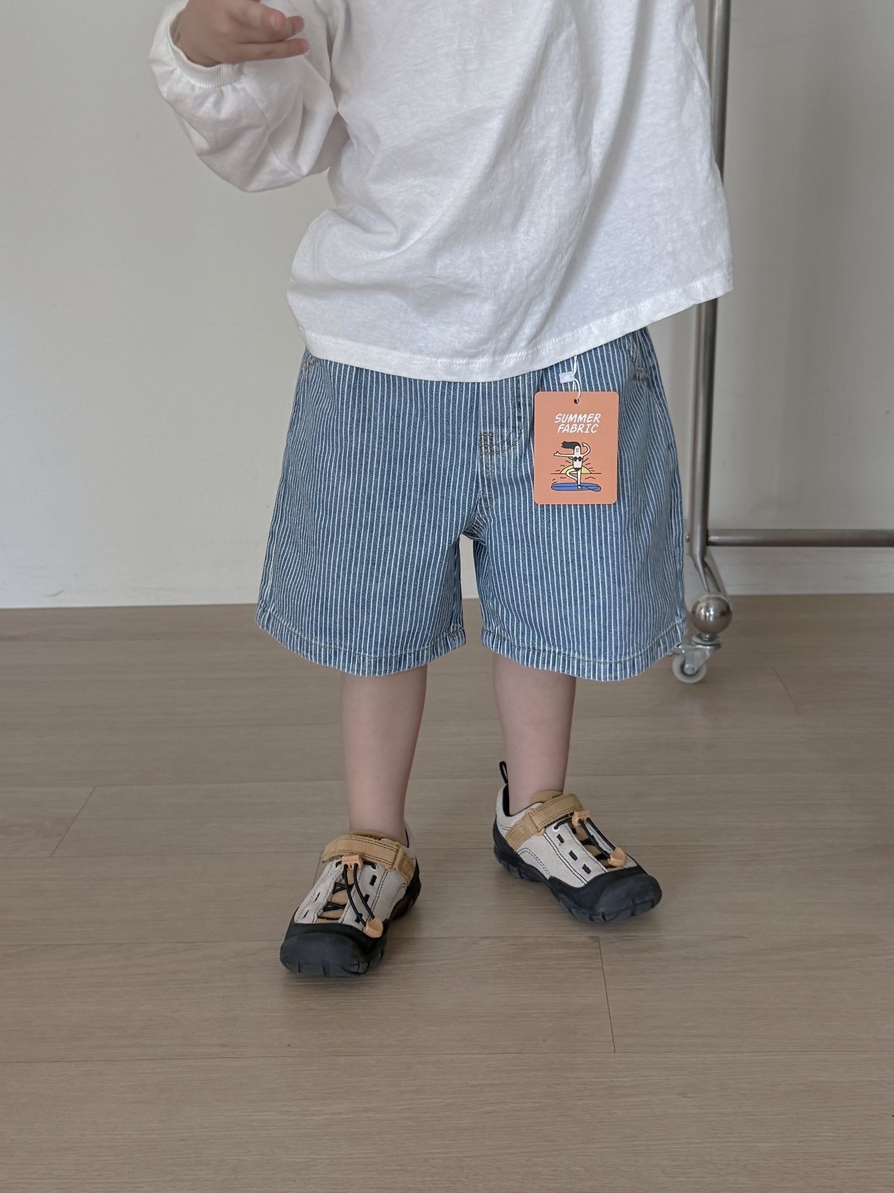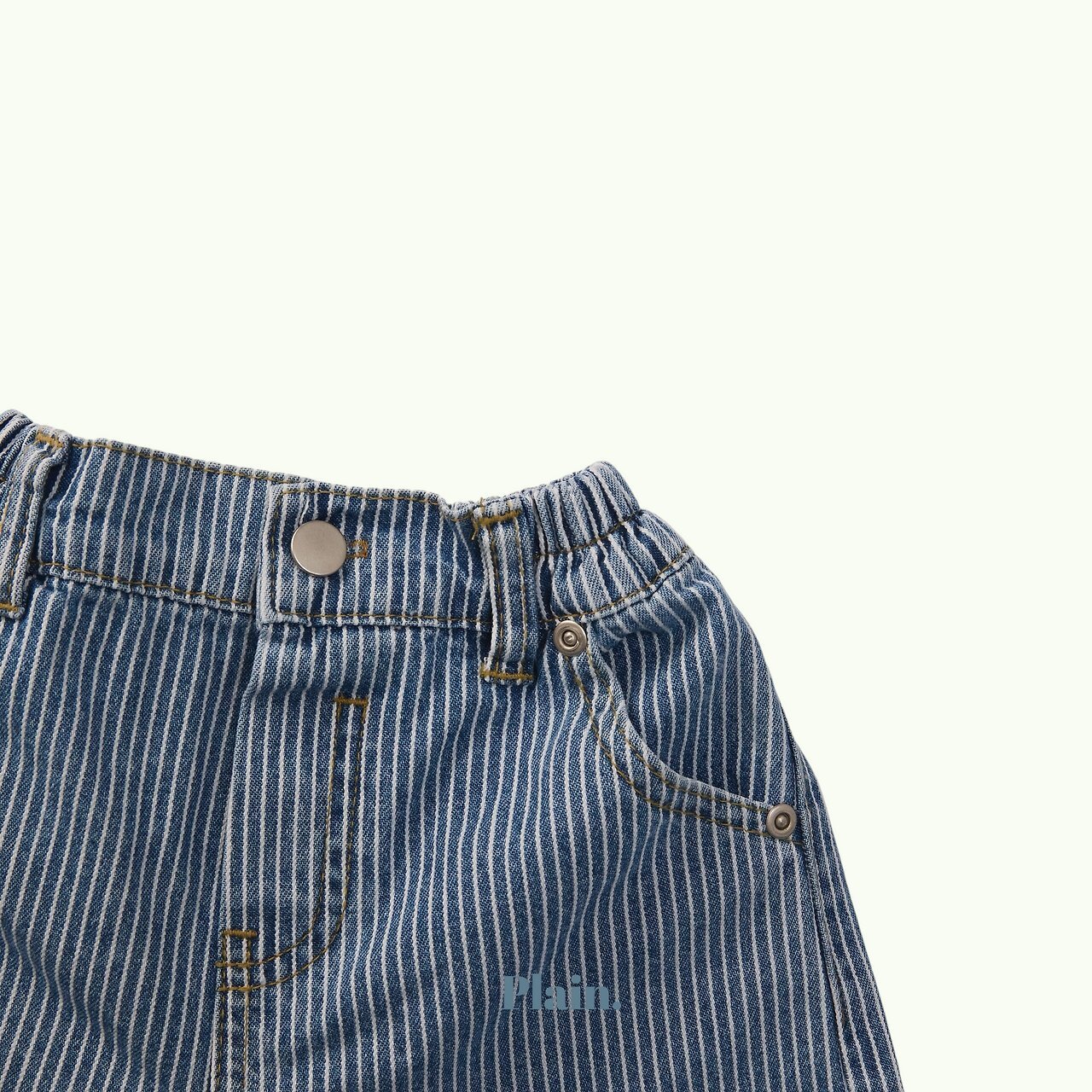 以扎實牛仔布料製作,搭配條紋圖案設計的牛仔短褲