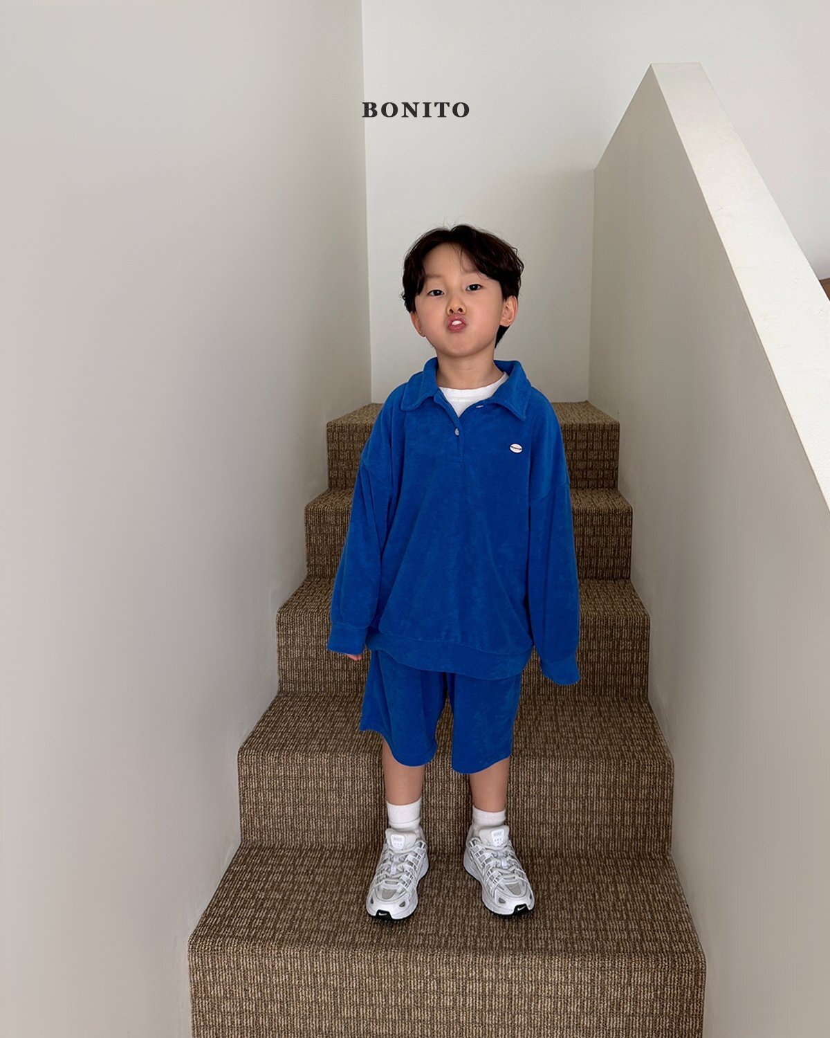 這是一款採用毛圈布(Terry)面料製作的翻領T恤上下套裝