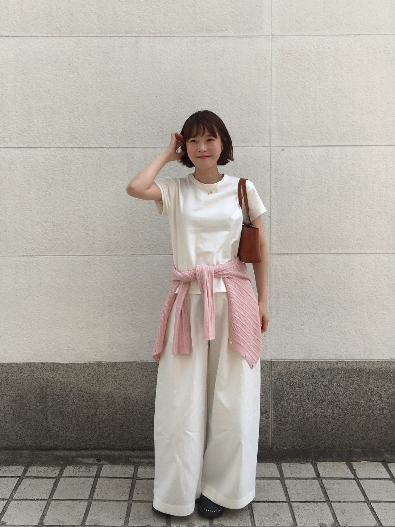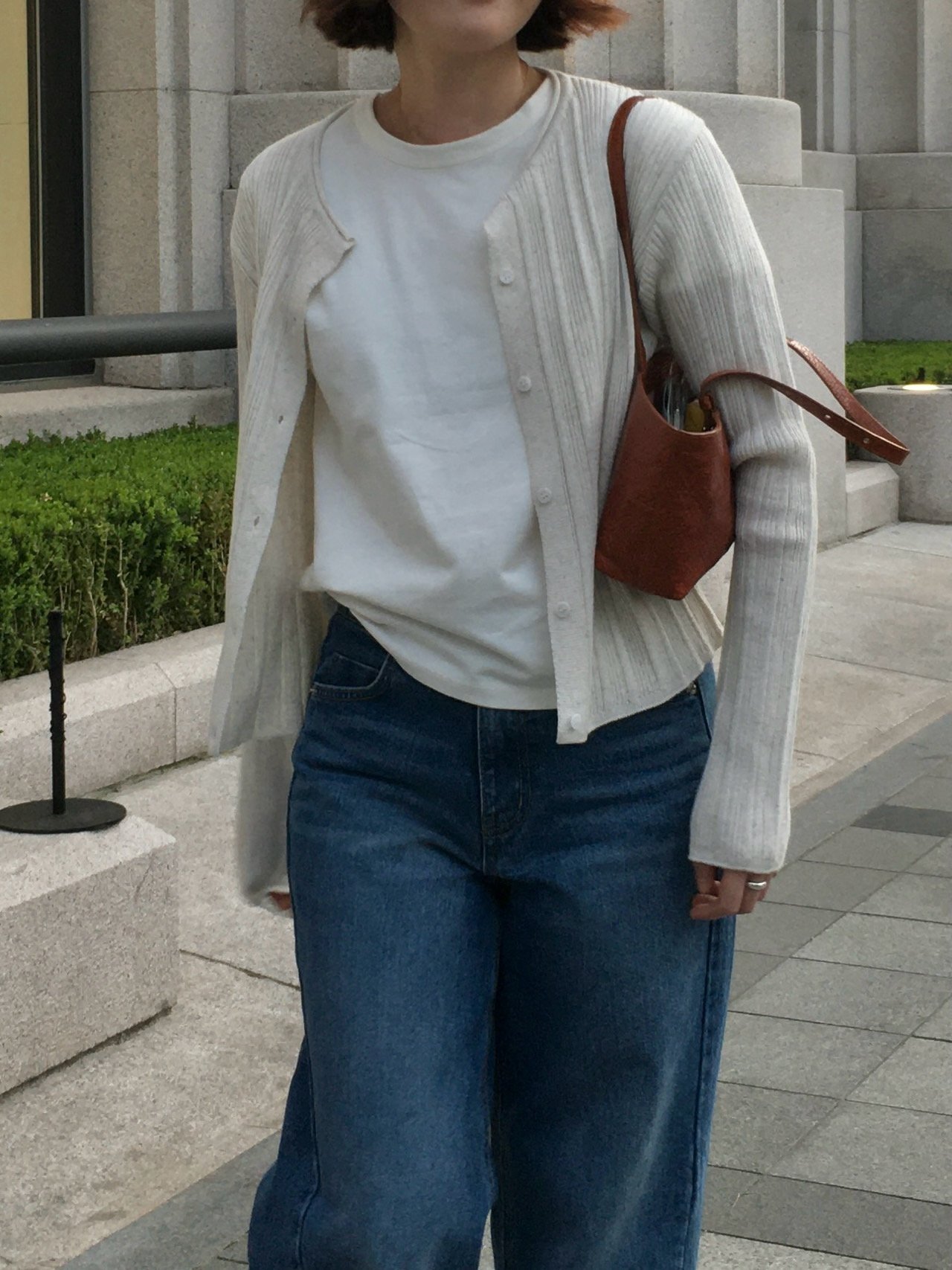 領口為柔和的圓領剪裁,帶來舒適且溫和的視覺感受。前方搭配極簡鈕扣設計,不破壞整體風格,同時自然融入整體造型